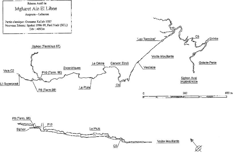 One week later we return to the cave, together with Fadi Baeyno (ALES). Using far Western techniques and the support of all gods of the 16 different official Lebanese religions, we managed to climb the cascade. The meander behind it, unfortunately gets too narrow after 15 meters. The cave was mapped by ALES in early 1996. They measured 725m of development. The highest point on top of the cascade lies 32m above the entrance level.